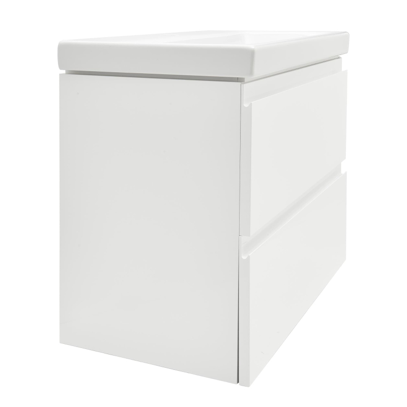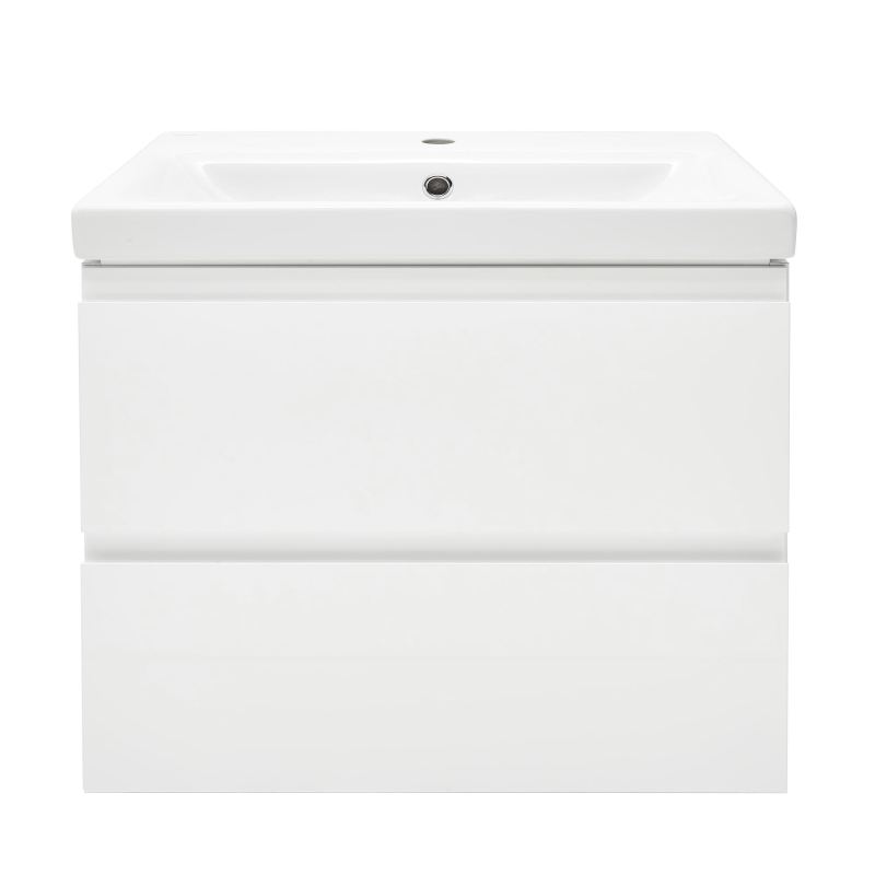Závesná kúpeľňová skrinka s keramickým umývadlom v bielej farbe s lesklým povrchom o rozmere 60x37,5x62 cm s fóliovaným povrchom. S pomalým zatváraním.