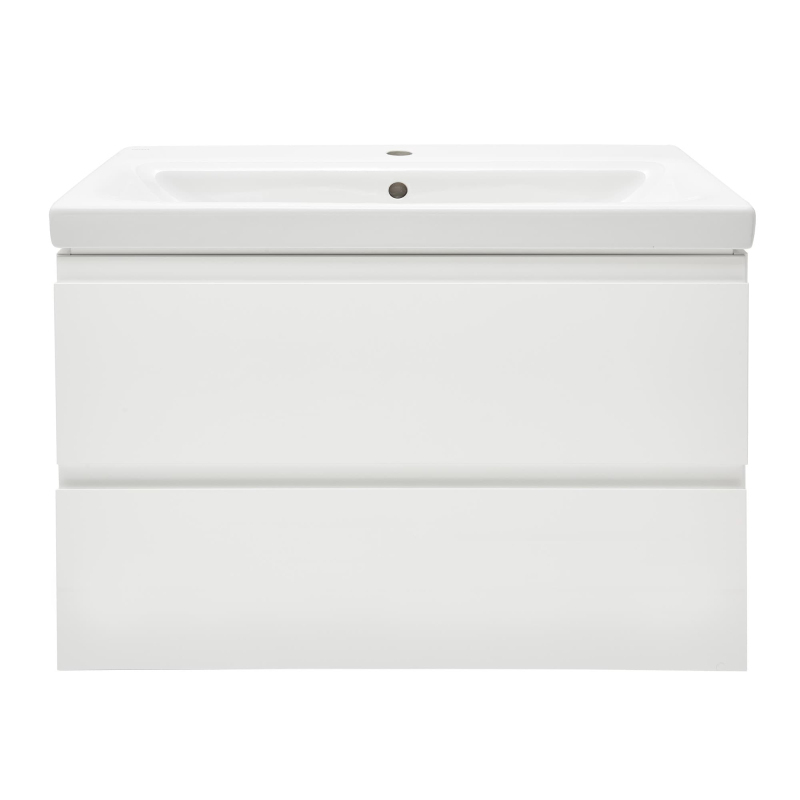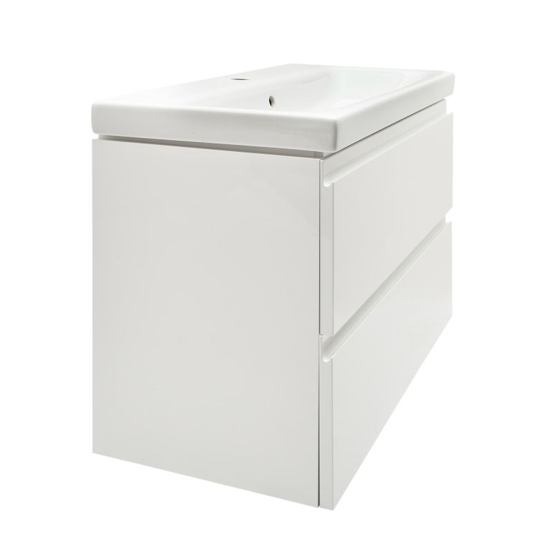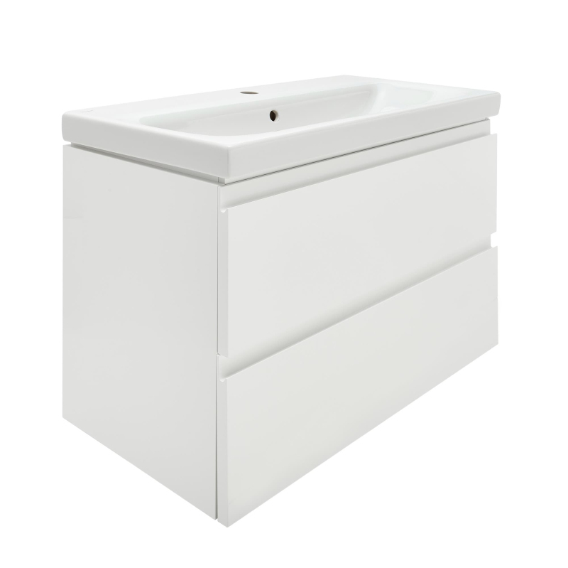 Závesná kúpeľňová skrinka s keramickým umývadlom v bielej farbe s lesklým povrchom o rozmere 80x37,5x62 cm s fóliovaným povrchom S pomalým zatváraním.