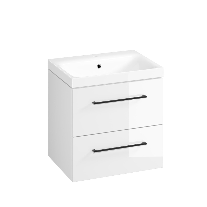 Závesná kúpeľňová skrinka s keramickým umývadlom v bielej farbe s lesklým povrchom o rozmere 60x61.5x45 cm. Povrch v prevedení lamino. Úchytky je nutné objednať samostatne.