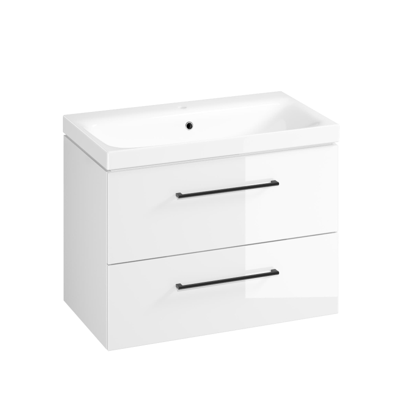 Závesná kúpeľňová skrinka s keramickým umývadlom v bielej farbe s lesklým povrchom o rozmere 80x61,5x45 cm. Povrch v prevedení lamino. Držadlá je nutné objednať samostatne.