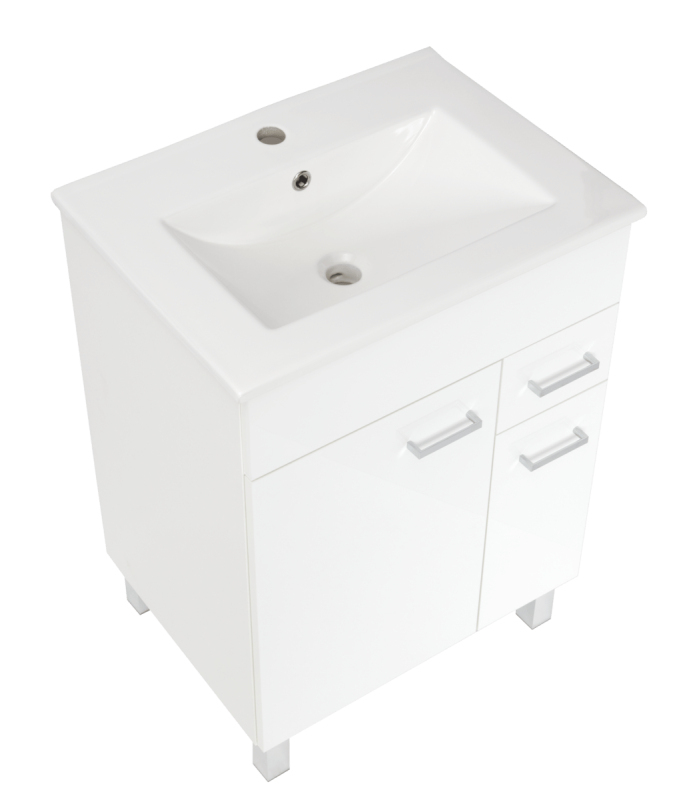 SIKO ekonomická skrinka s keramickým umývadlom. Prevedenie z lamina, lakované sú iba čelné plochy a je dodávaná v rozloženom stave. Vybavenie skrinky je 1x zásuvka (s obyčajnými pojazdmi), 2x dvierka, 1x polica.