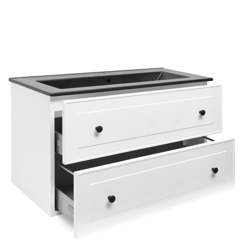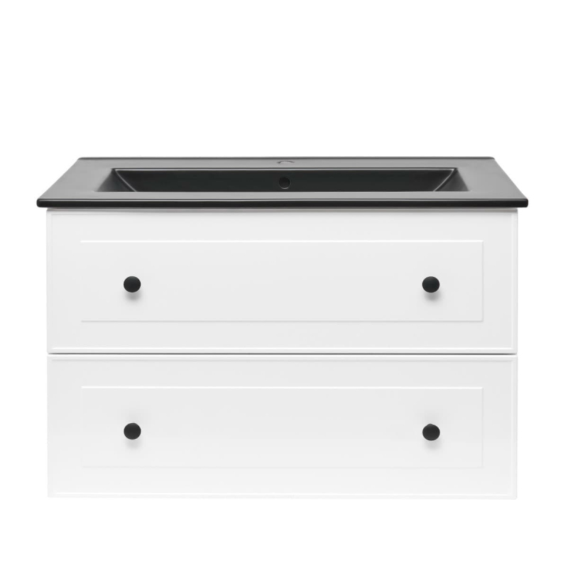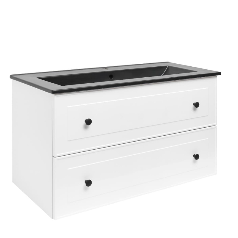 Závesná kúpeľňová skrinka s keramickým umývadlom v bielej farbe s lesklým povrchom o rozmere 100x53x46 cm. Povrch v prevedení fólie.