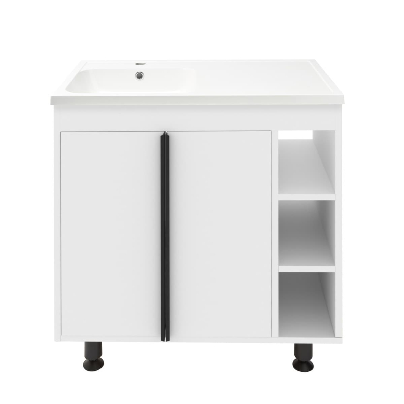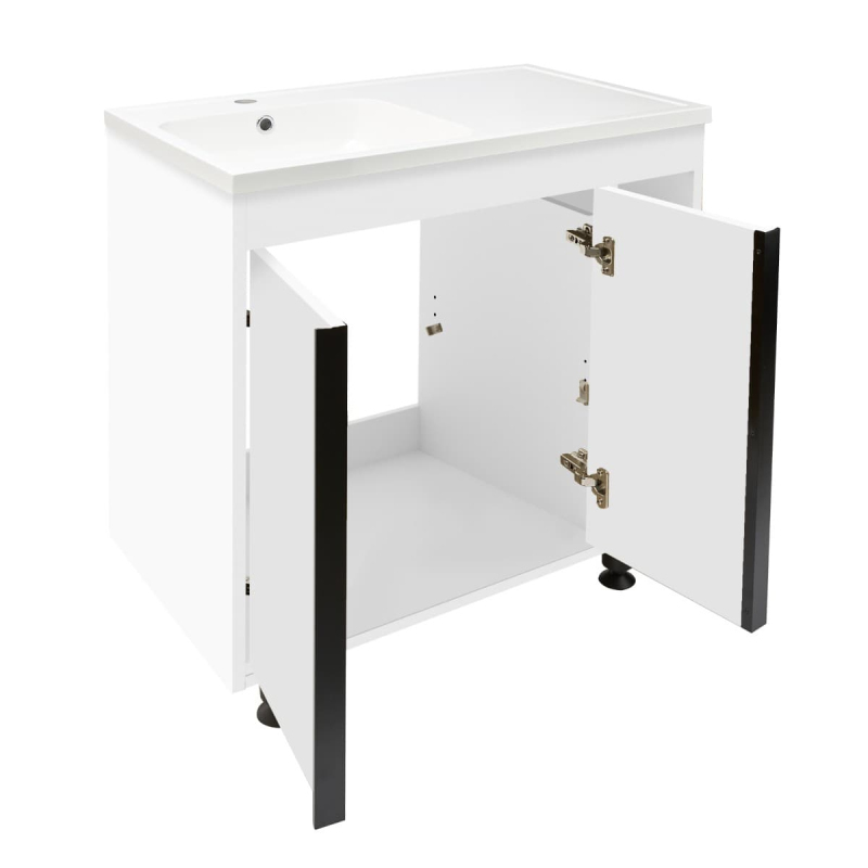 Stojaca kúpeľňová skrinka s umývadlom z liateho mramoru v bielej farbe s lesklým povrchom o rozmere 79x70x45 cm. S lakovaným povrchom. Dvierka majú ľavé aj pravé otváranie.