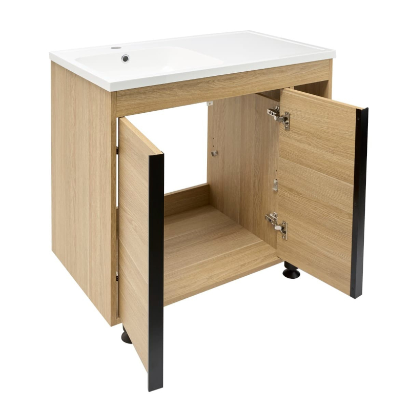 Stojaca kúpeľňová skrinka s umývadlom z liateho mramoru v dekore dub s matným povrchom o rozmere 79x70x45 cm. Povrch v prevedení lamino. Dvierka majú ľavé aj pravé otváranie.