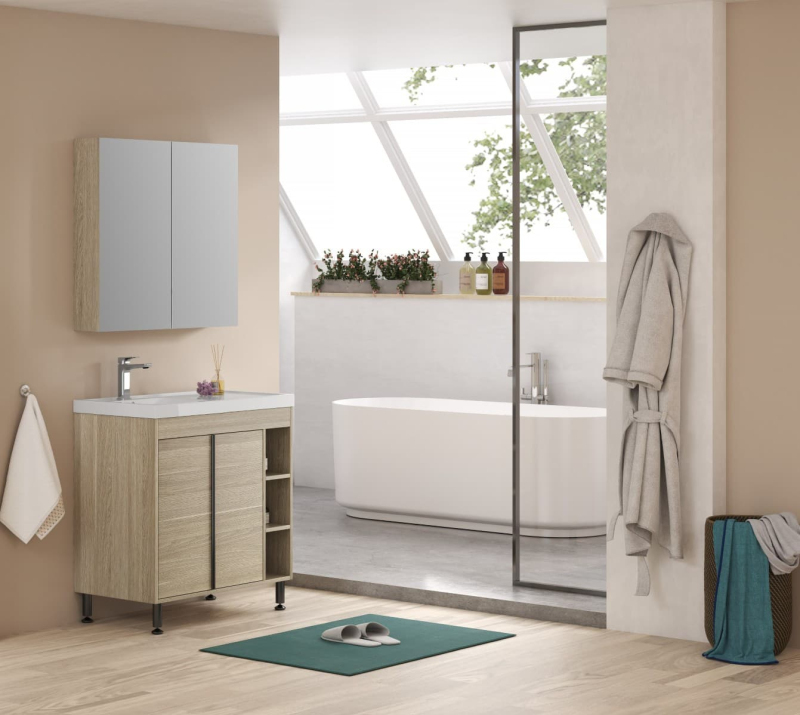 Stojaca kúpeľňová skrinka s umývadlom z liateho mramoru v dekore dub s matným povrchom o rozmere 79x70x45 cm. Povrch v prevedení lamino. Dvierka majú ľavé aj pravé otváranie.