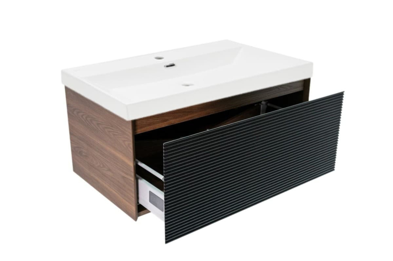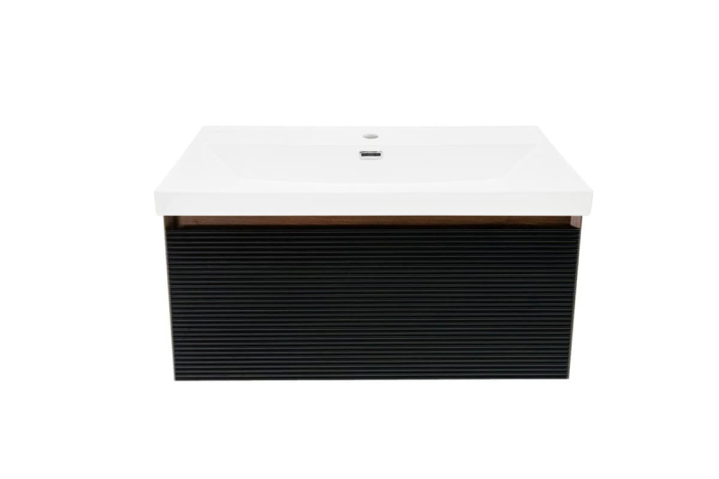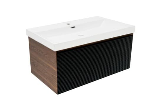 Závesná kúpeľňová skrinka s keramickým umývadlom v dekore orech s matným povrchom o rozmere 79x30x45 cm. Povrch v prevedení lamino.