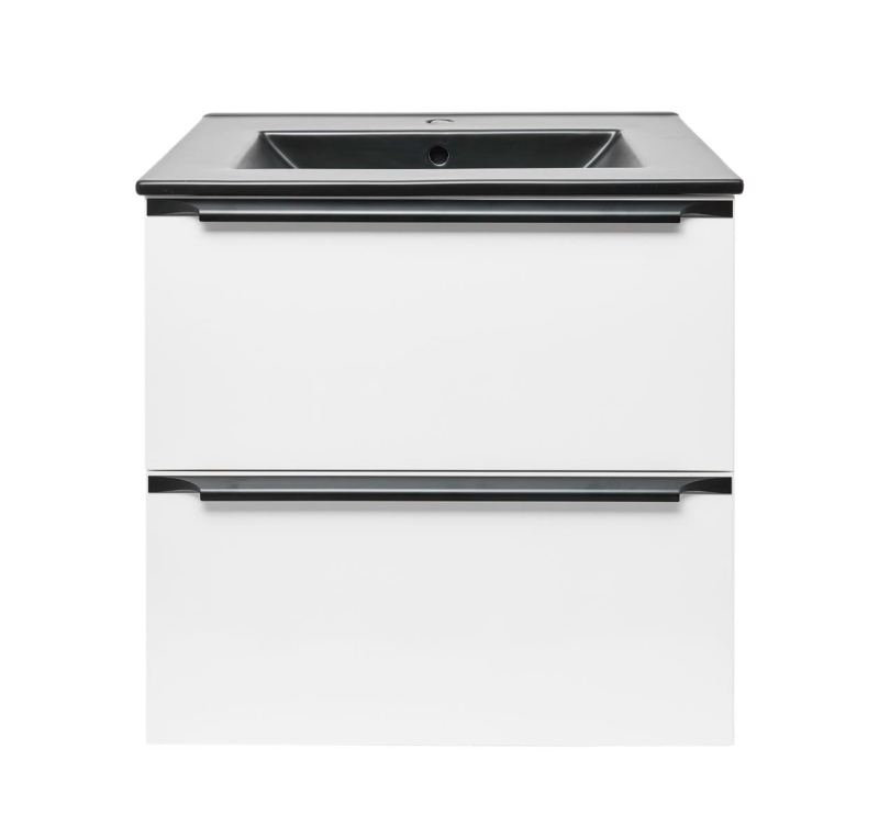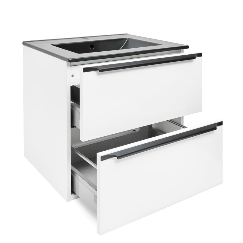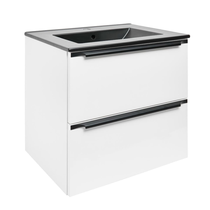 Závesná kúpeľňová skrinka s keramickým umývadlom v bielom prevedení s lesklým povrchom o rozmere 60x60x46 cm. Povrch v prevedení lamino.