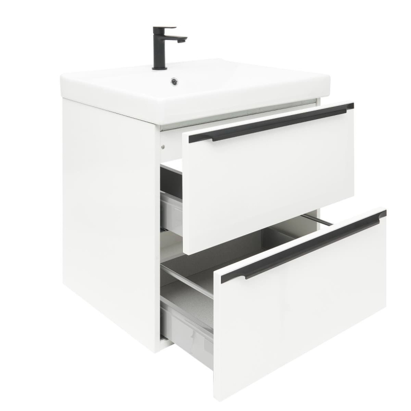 Závesná kúpeľňová skrinka s keramickým umývadlom vo farebnom prevedení biela lesk s lesklým povrchom o rozmere 60x60x46 cm. Povrch v prevedení lamino.