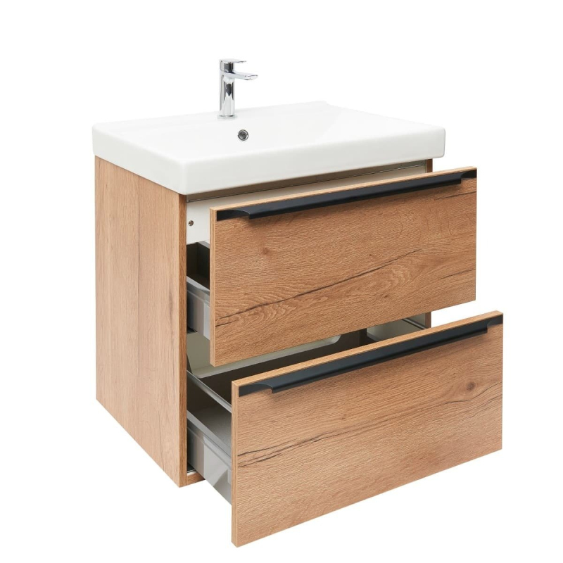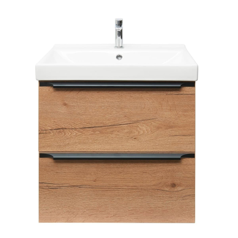 Závesná kúpeľňová skrinka s keramickým umývadlom v prevedení dub Sierra s matným povrchom o rozmere 60x60x46 cm. Povrch v prevedení lamino.