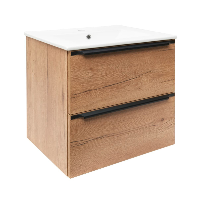 Závesná kúpeľňová skrinka s keramickým umývadlom v prevedení dub Sierra o rozmere 60x60x46 cm. Povrch v prevedení lamino. S plnovýsuvom a doťahom.