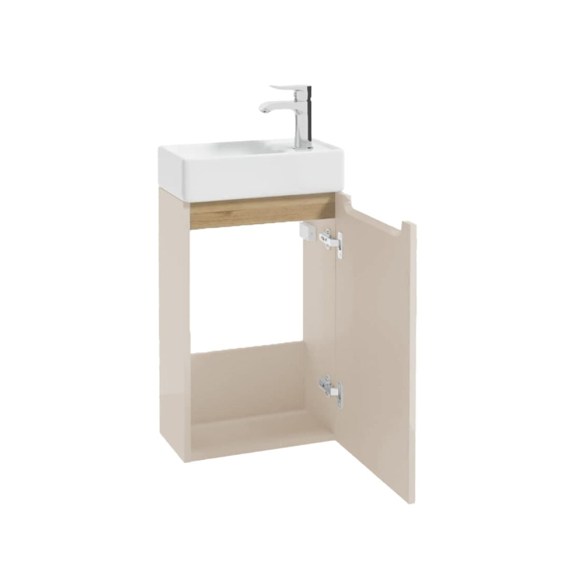 Závesná kúpeľňová skrinka s keramickým umývadlom vo farebnom prevedení kašmír s matným povrchom o rozmere 39x60x22 cm. S povrchom z MDF dosky