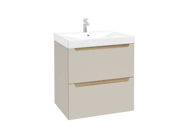 Závesná kúpeľňová skrinka s keramickým umývadlom vo farebnom prevedení kašmír s matným povrchom o rozmere 60x60x45 cm. S povrchom z MDF dosky. S plnovýsuvom a doťahom.