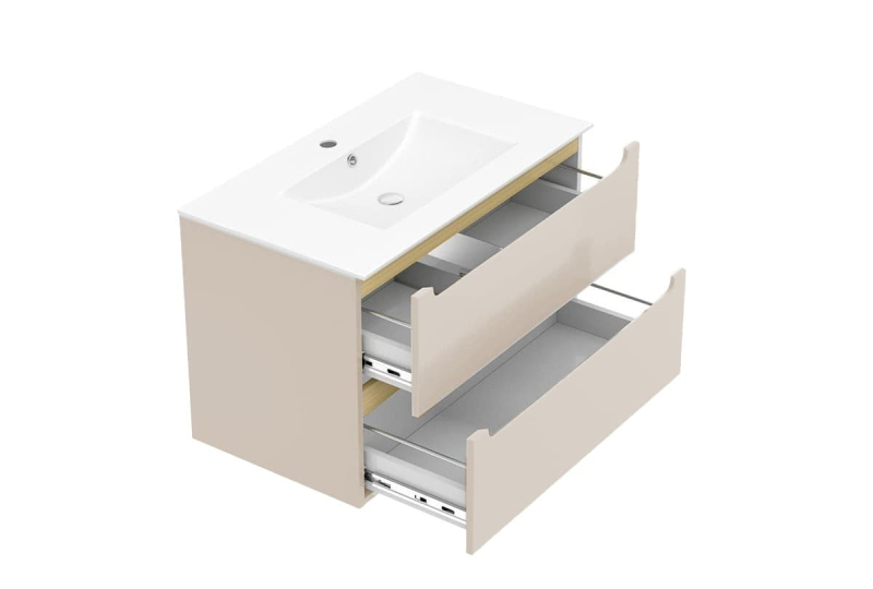 Závesná kúpeľňová skrinka s keramickým umývadlom vo farebnom prevedení kašmír s matným povrchom o rozmere 80x60x45 cm. S povrchom z MDF dosky. S plnovýsuvom a doťahom.