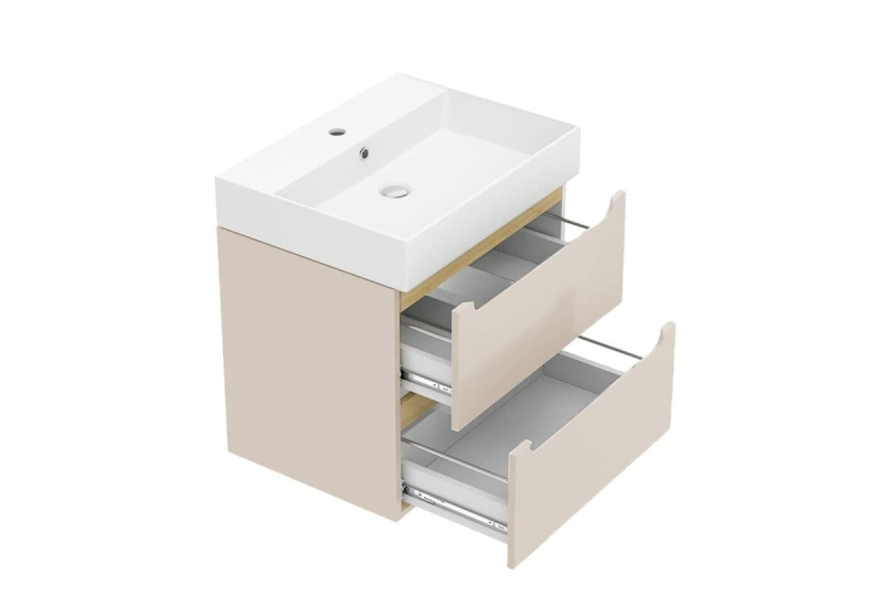 Závesná kúpeľňová skrinka s keramickým umývadlom vo farebnom prevedení kašmír s matným povrchom o rozmere 80x60x45 cm. S povrchom z MDF dosky. S plnovýsuvom a doťahom.