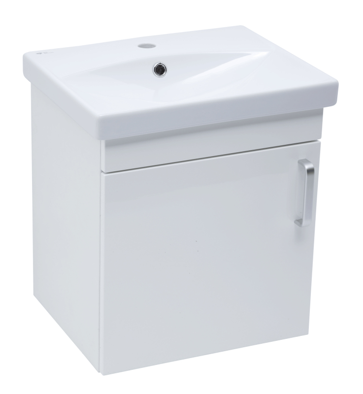 Závesná kúpeľňová skrinka s keramickým umývadlom v bielej farbe s lesklým povrchom o rozmere 50x51x40 cm. s fóliovaným povrchom S pomalým zatváraním. Dvierka majú ľavé aj prvé otváranie.
