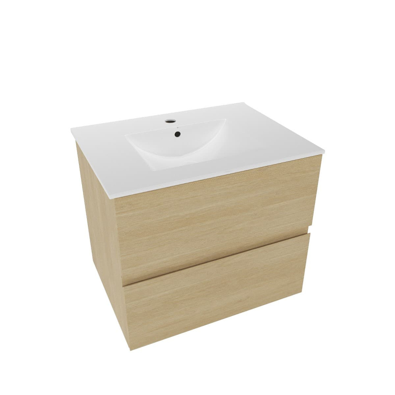 Závesná kúpeľňová skrinka s keramickým umývadlom v dekore svetlé drevo s matným povrchom o rozmere 60x50x45,5 cm. Povrch v prevedení lamino.