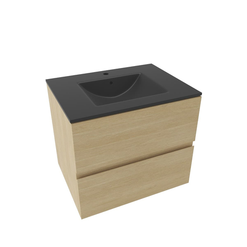 Závesná kúpeľňová skrinka s keramickým umývadlom v dekore svetlé drevo s matným povrchom o rozmere 60x50x45,5 cm. Povrch v prevedení lamino.
