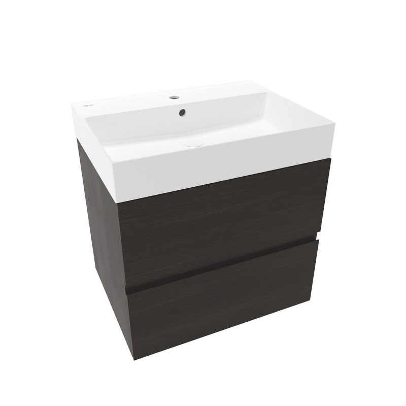 Závesná kúpeľňová skrinka s keramickým umývadlom vo farebnom prevedení tmavé drevo s matným povrchom o rozmere 60x50x45,5 cm. Povrch v prevedení lamino.