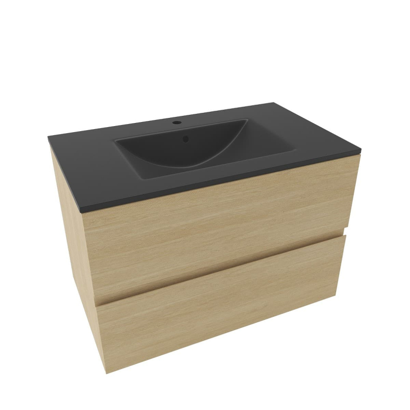 Závesná kúpeľňová skrinka s keramickým umývadlom v dekore svetlé drevo s matným povrchom o rozmere 80x50x45,5 cm. Povrch v prevedení lamino.