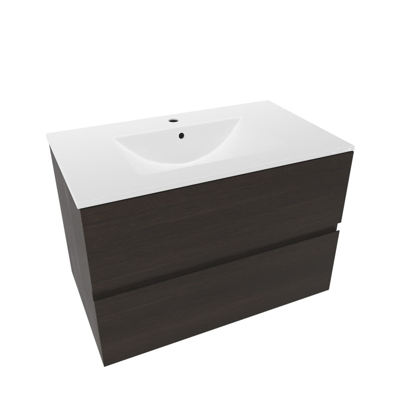 Závesná kúpeľňová skrinka s keramickým umývadlom vo farebnom prevedení tmavé drevo s matným povrchom o rozmere 80x50x45,5 cm. Povrch v prevedení lamino.