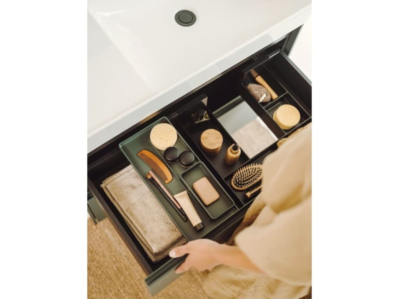 Závesná kúpeľňová skrinka s keramickým umývadlom v pieskovom prevedení s matným povrchom o rozmere 60x64,5x46 cm. Povrch v prevedení lamino. Plnovýsuv s doťahom, bez sifónu, s vnútorným organizérom