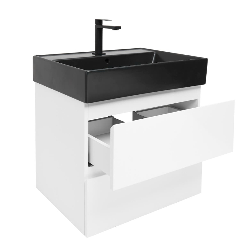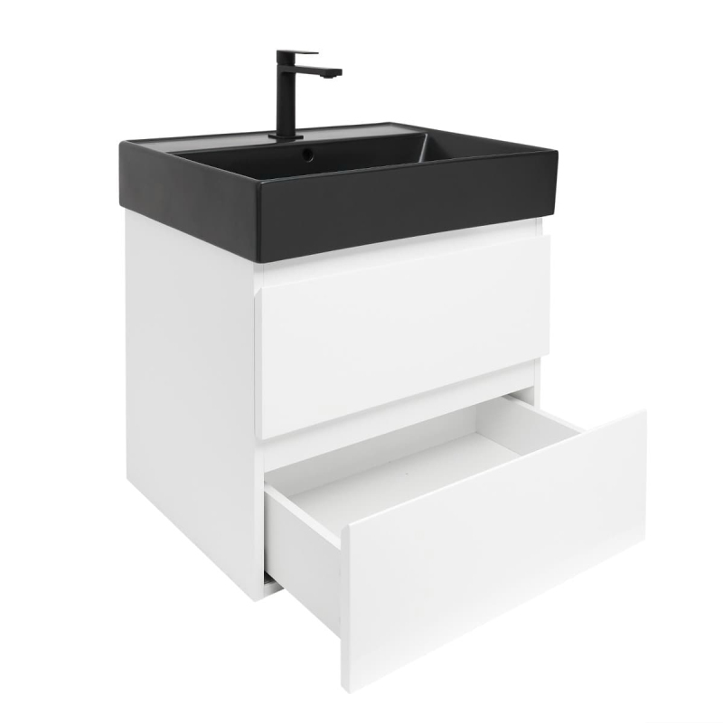 Závesná kúpeľňová skrinka s keramickým umývadlom v bielej farbe s lesklým povrchom o rozmere 59x50x45 cm. Povrch v prevedení lamino.