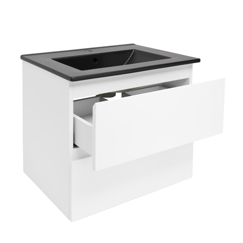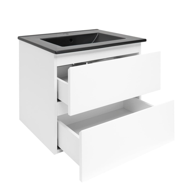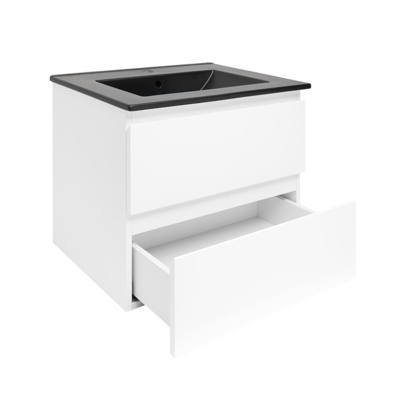 Závesná kúpeľňová skrinka s keramickým umývadlom v bielej farbe s lesklým povrchom o rozmere 59x50x45 cm. Povrch v prevedení lamino.