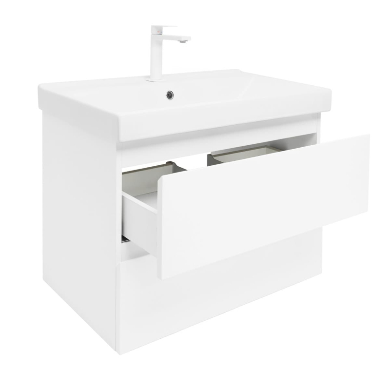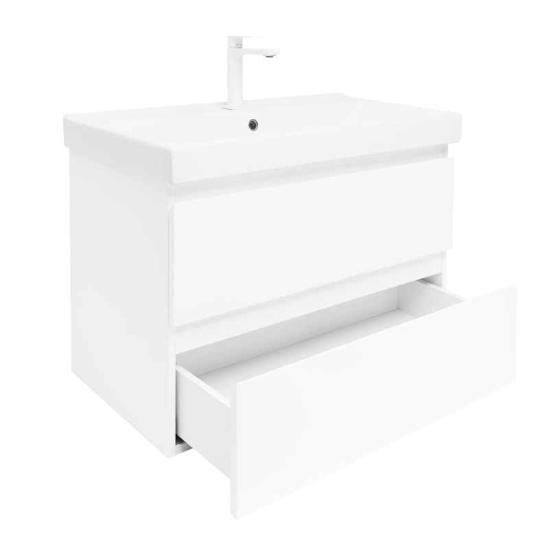 Závesná kúpeľňová skrinka s keramickým umývadlom v bielej farbe s lesklým povrchom o rozmere 79x50x45 cm. Povrch v prevedení lamino.