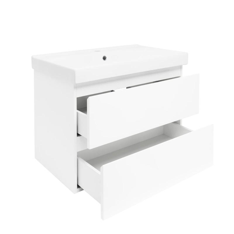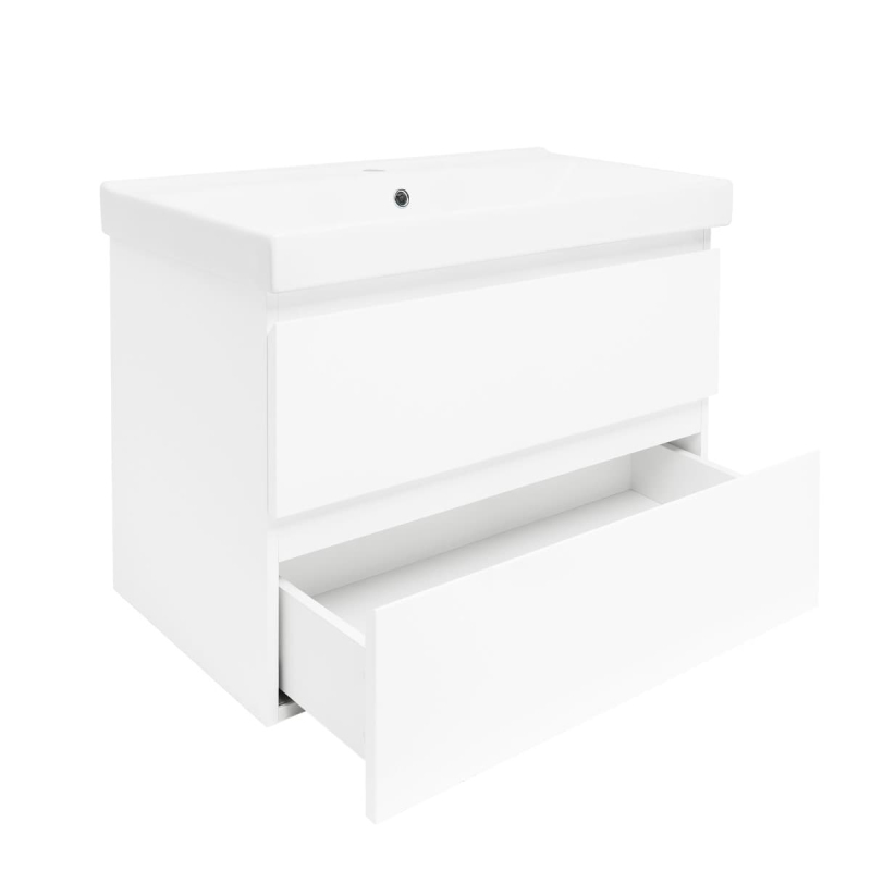 Závesná kúpeľňová skrinka s keramickým umývadlom v bielej farbe s lesklým povrchom o rozmere 79x50x45 cm. Povrch v prevedení lamino.