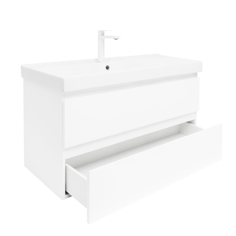 Závesná kúpeľňová skrinka s keramickým umývadlom v bielej farbe s lesklým povrchom o rozmere 99x50x45 cm. Povrch v prevedení lamino.