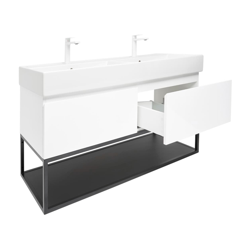 Závesná kúpeľňová skrinka s keramickým umývadlom v bielej farbe v lesklom prevedení o rozmere 119x30x45 cm. Povrch v prevedení lamino.