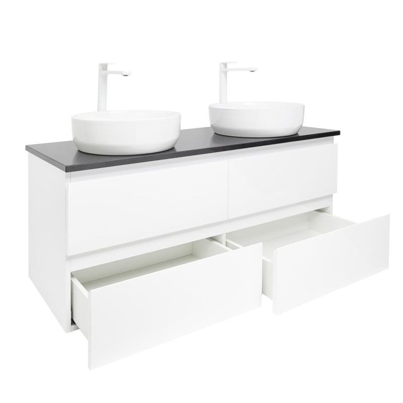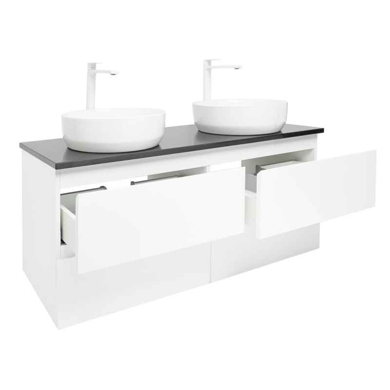 Závesná kúpeľňová skrinka s keramickým umývadlom v bielej farbe v lesklom prevedení o rozmere 119x50x45 cm. Povrch v prevedení lamino.