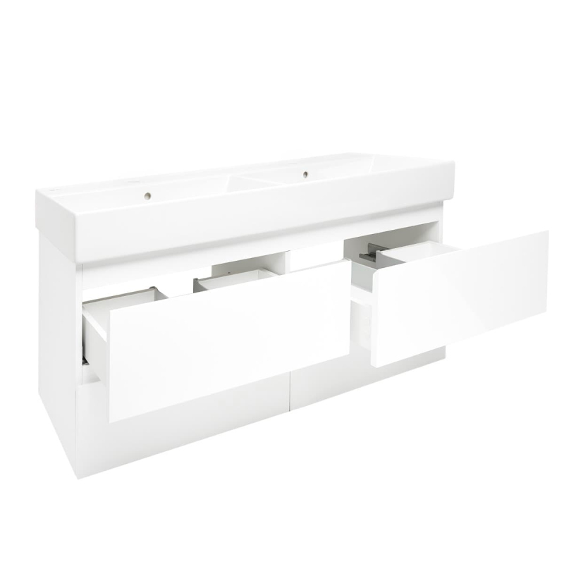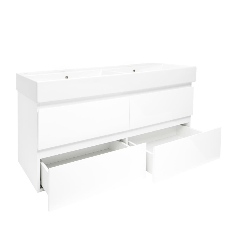 Závesná kúpeľňová skrinka s keramickým umývadlom v bielej farbe v lesklom prevedení o rozmere 119x50x45 cm. Povrch v prevedení lamino.