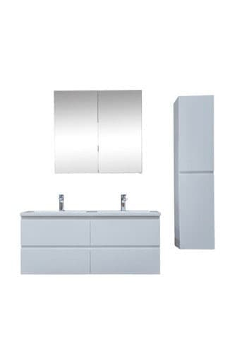 Závesná kúpeľňová skrinka s umývadlom z liateho mramoru v bielej farbe v lesklom prevedení o rozmere 119x50x45 cm. Povrch v prevedení lamino. Vrátane zrkadla.