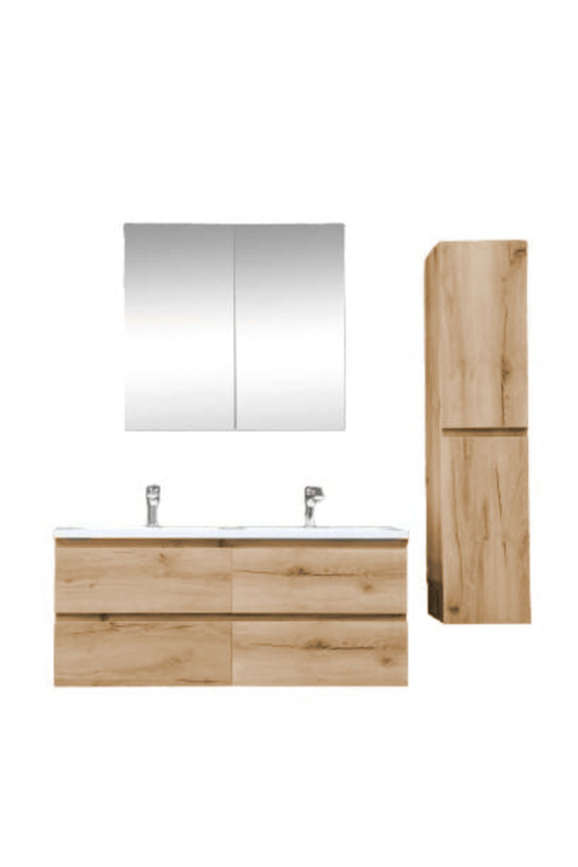 Závesná kúpeľňová skrinka s umývadlom z liateho mramoru v dekore dub s matným povrchom o rozmere 119x50x45 cm. Povrch v prevedení lamino. Vrátane zrkadla.