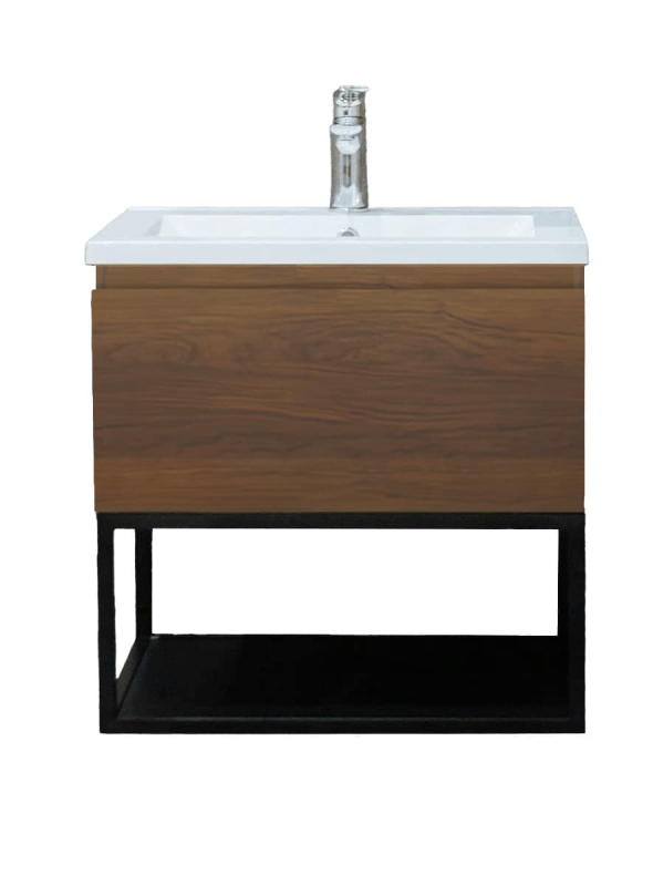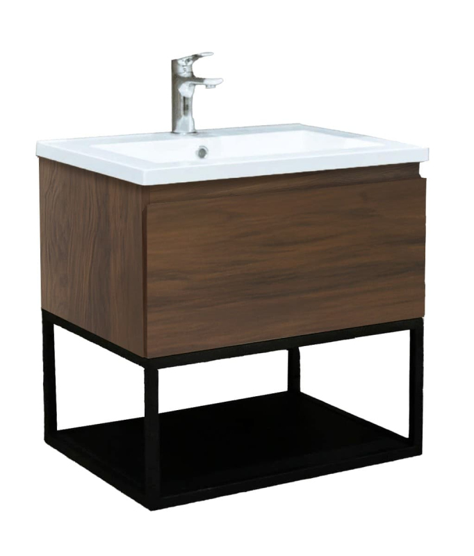 Závesná kúpeľňová skrinka s umývadlom z liateho mramoru v dekore orech s matným povrchom o rozmere 59x30x45 cm. Povrch v prevedení lamino.