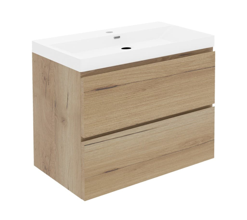 Závesná kúpeľňová skrinka s keramickým umývadlom v dekore dub s matným povrchom o rozmere 59x50x45 cm. Povrch v prevedení lamino.