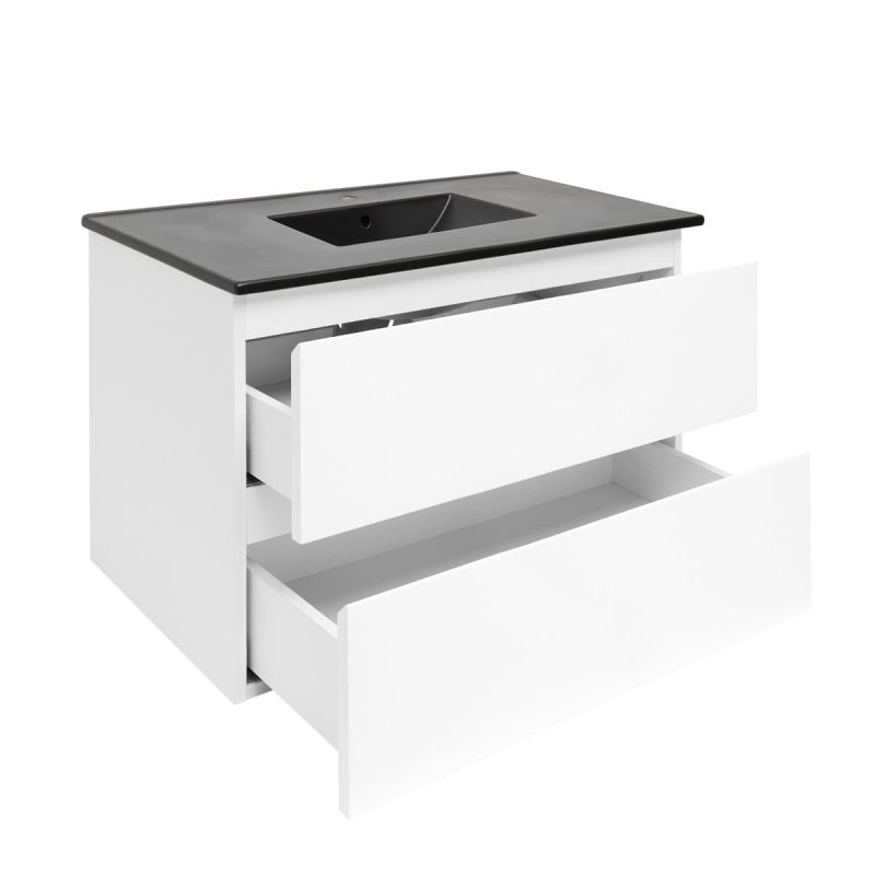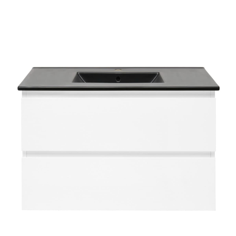 Závesná kúpeľňová skrinka s keramickým umývadlom v bielej farbe s lesklým povrchom o rozmere 79x50x45 cm. Povrch v prevedení lamino.