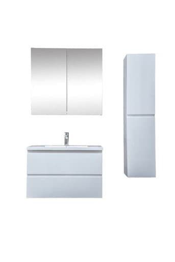 Závesná kúpeľňová skrinka s umývadlom z liateho mramoru v bielej farbe v lesklom prevedení o rozmere 79x50x45 cm. Povrch v prevedení lamino. Vrátane zrkadla.