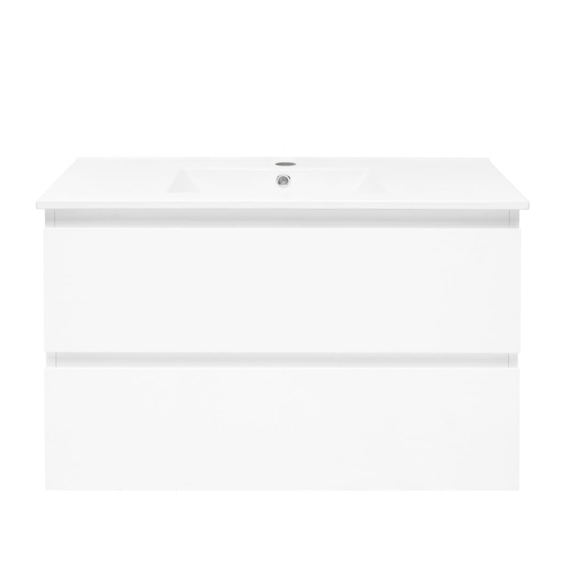 Závesná kúpeľňová skrinka s keramickým umývadlom v bielej farbe s matným povrchom o rozmere 79x50x45 cm. Povrch v prevedení lamino.