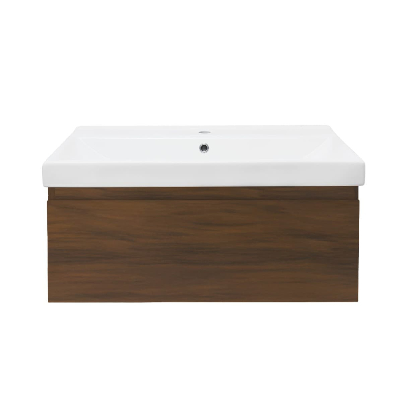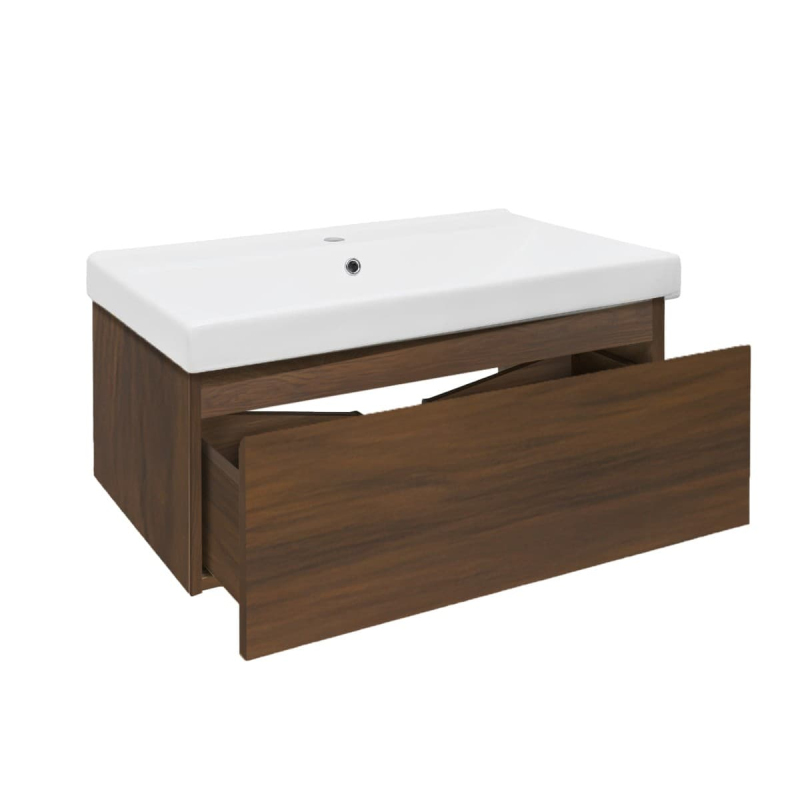 Závesná kúpeľňová skrinka s keramickým umývadlom v dekore orech s matným povrchom o rozmere 80x30x45 cm. Povrch v prevedení lamino.