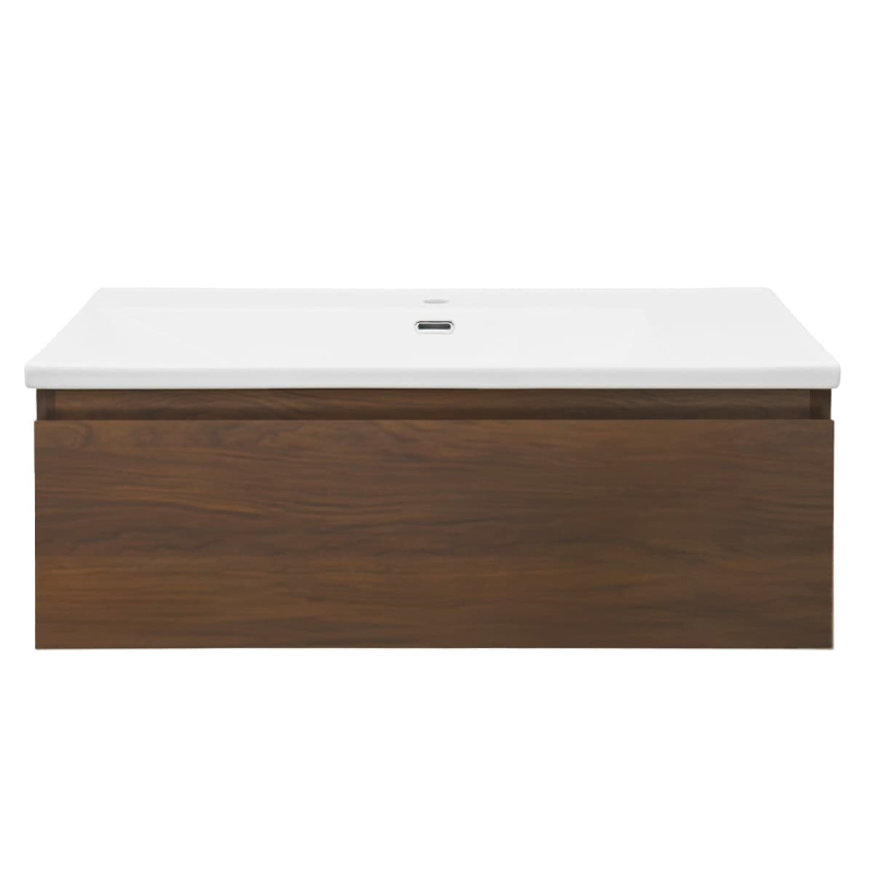 Závesná kúpeľňová skrinka s keramickým umývadlom v dekore orech s matným povrchom o rozmere 99x30x45 cm. Povrch v prevedení lamino.
