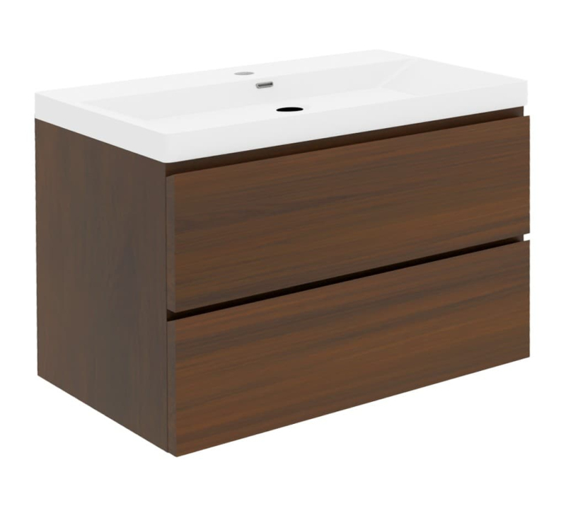 Závesná kúpeľňová skrinka s keramickým umývadlom v dekore orech s matným povrchom o rozmere 99x30x45 cm. Povrch v prevedení lamino.