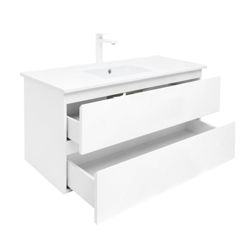 Závesná kúpeľňová skrinka s keramickým umývadlom v bielej farbe s lesklým povrchom o rozmere 99x50x45 cm. Povrch v prevedení lamino.