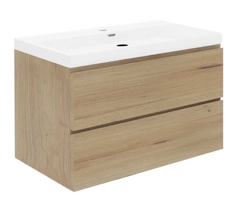 Závesná kúpeľňová skrinka s keramickým umývadlom v dekore dub s matným povrchom o rozmere 99x50x45 cm. Povrch v prevedení lamino.