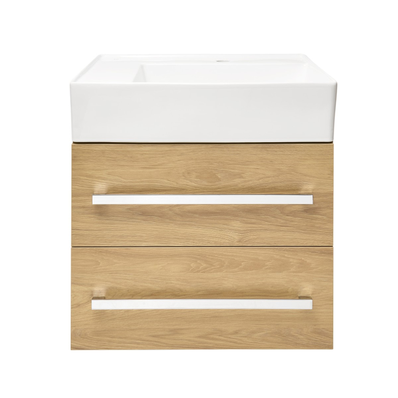 Závesná kúpeľňová skrinka s keramickým umývadlom v prevedení dub hickory s matným povrchom o rozmere 60x53x46 cm. Povrch v prevedení lamino.