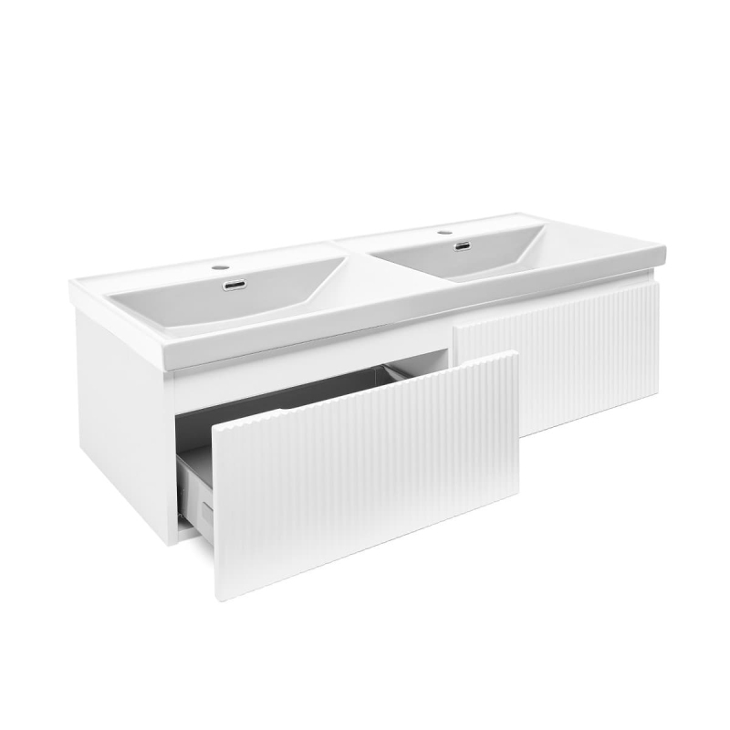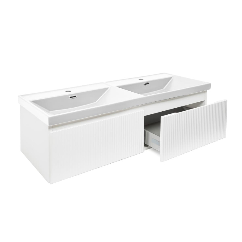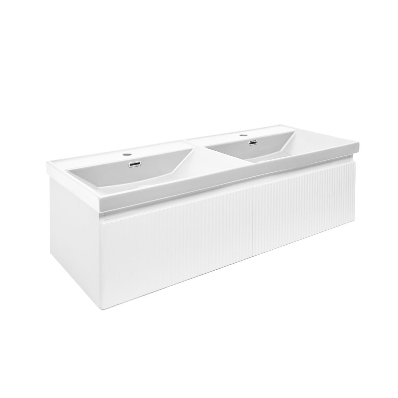 Závesná kúpeľňová skrinka s keramickým umývadlom v bielom prevedení s matným povrchom o rozmere 118x30x44, 8 cm. Povrch v prevedení lamino.