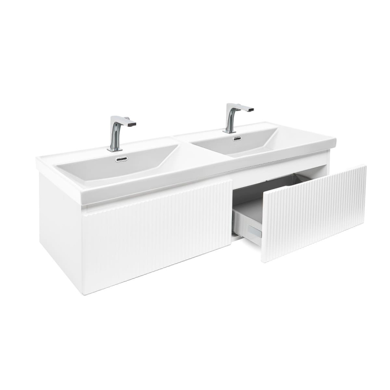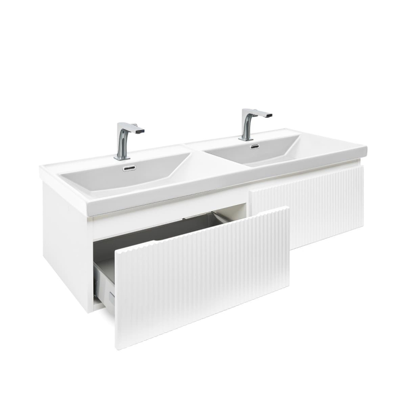 Závesná kúpeľňová skrinka s keramickým umývadlom v bielej farbe s matným povrchom o rozmere 118x30x44, 8 cm. Povrch v prevedení lamino.