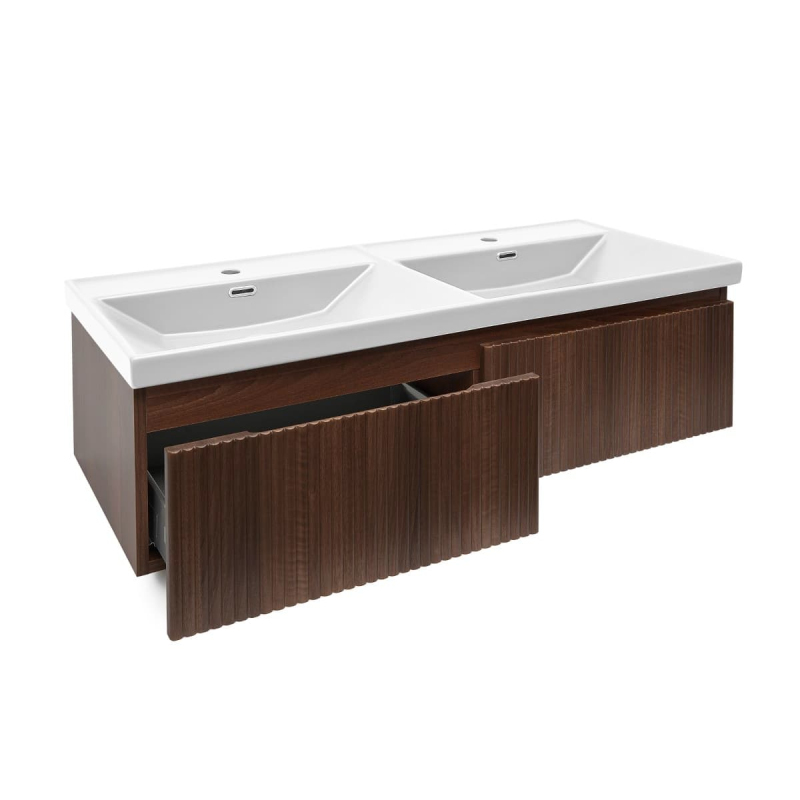 Závesná kúpeľňová skrinka s keramickým umývadlom vo farebnom prevedení orech aida s matným povrchom o rozmere 118x30x44,8 cm. Povrch v prevedení lamino.