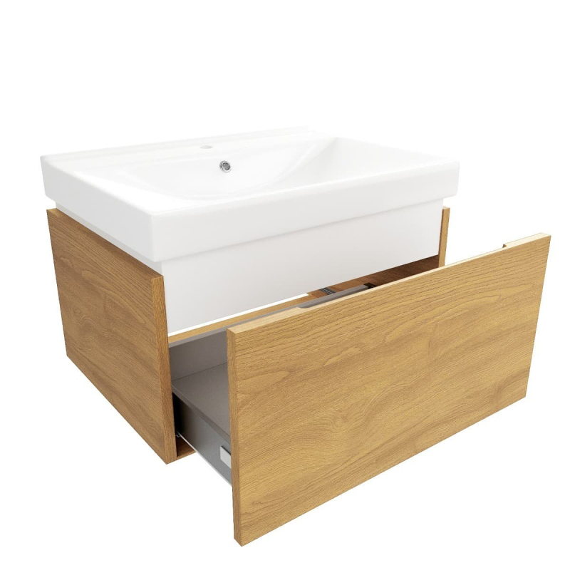 Závesná kúpeľňová skrinka s keramickým umývadlom vo farebnom prevedení medový dub s matným povrchom o rozmere 60x30x46 cm. Povrch v prevedení lamino.